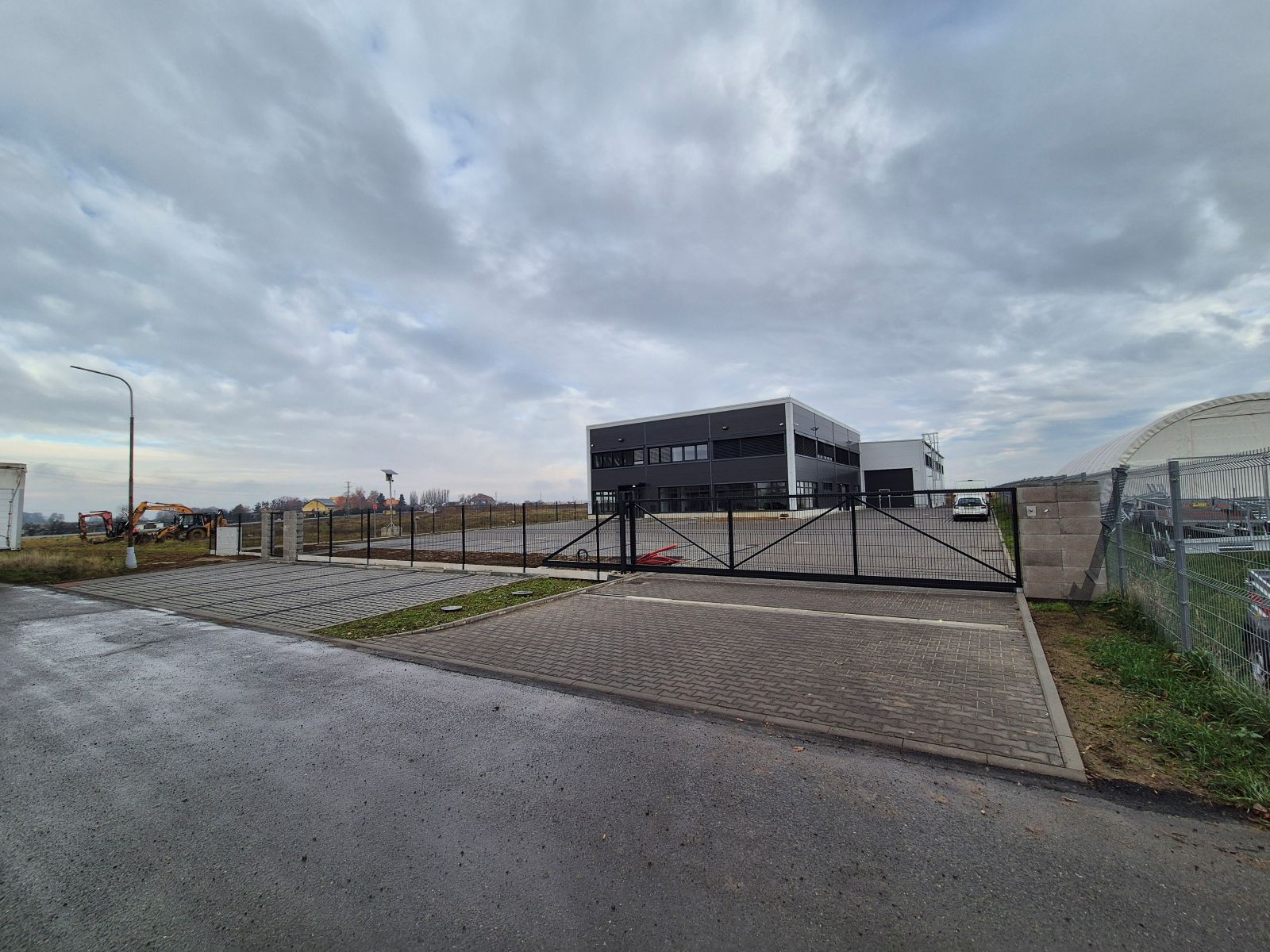 Novostavba haly + AB (zemní a výkopové práce, piloty, prefa konstrukce, opláštění, střecha), podlahy, dešťová kanalizace včetně vsaku, zpevněné plochy, terénní úpravy, vnitřní instalace (EL, TZB, VZT), projekt pro stavební povolení včetně kolaudace díla.